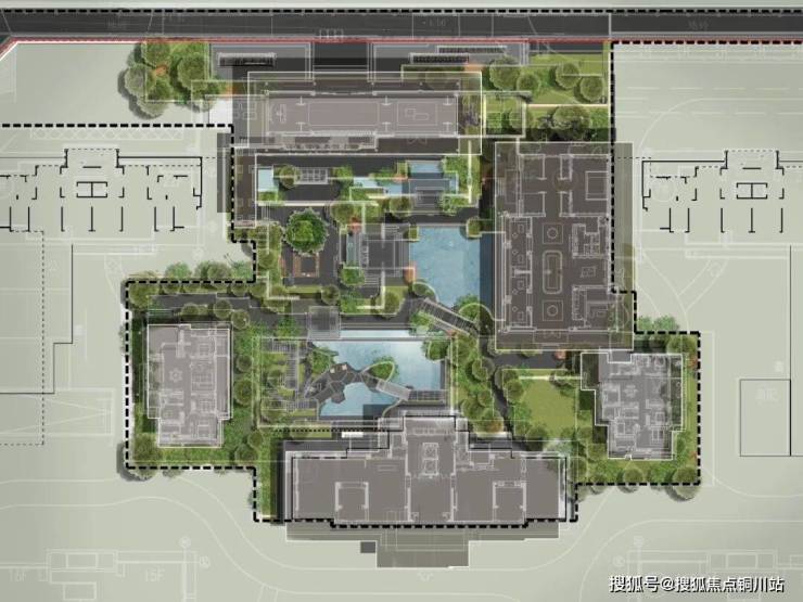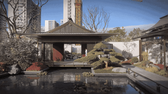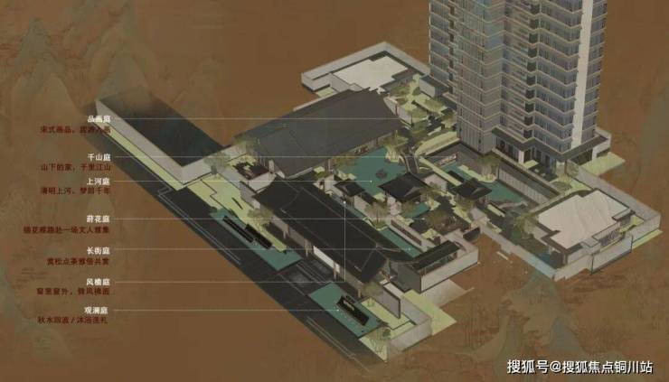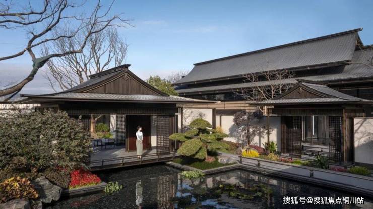 “庭院深深深几许,杨柳堆烟,帘幕无重数。”宋代庭院的普遍风尚为整体的景象简约而意境深远,擅于通过山水等借景的形式来营造景深的意境。整体庭院布局构造了“三进七庭”的雅居情境,一座隐桥悬于水面,将人们的生活串联起来,树影青葱,清风摇曳,为栖居增添一份趣味与诗意的体验。
