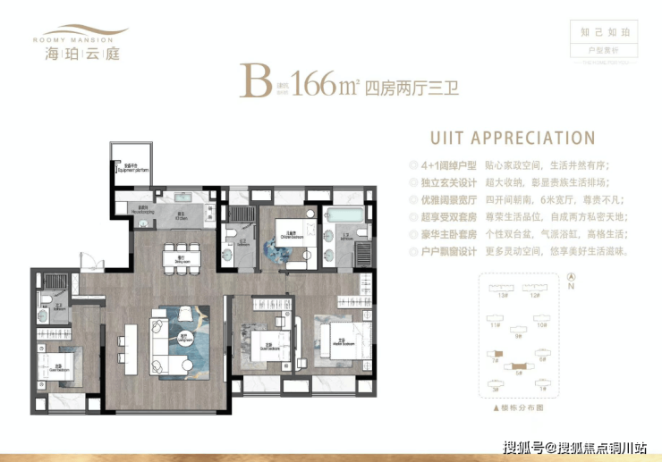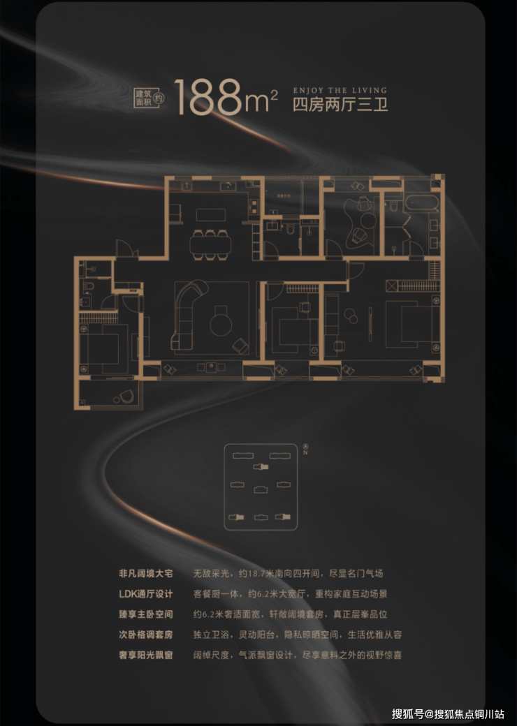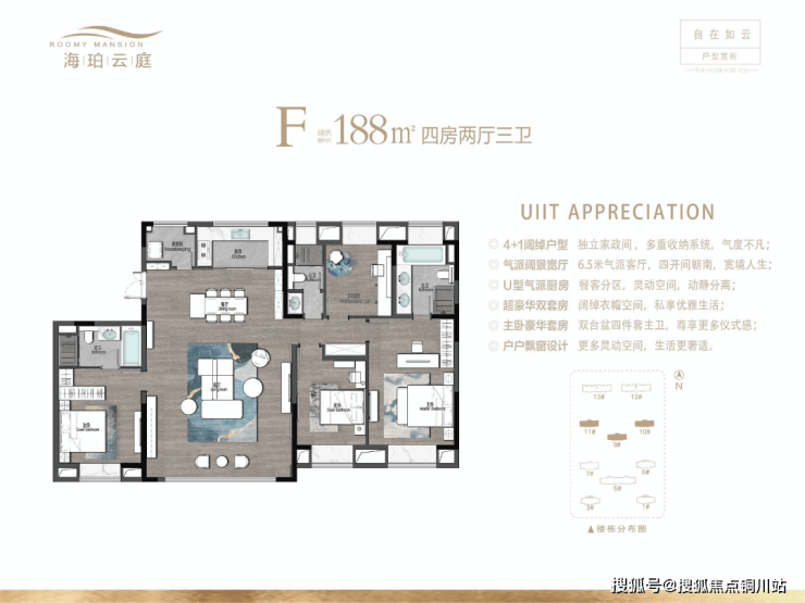 项目共计188户,总高5-6层,规划208㎡上叠、185㎡大平层以及224㎡-363㎡下叠产品,车位配比1:2.6,总车位495个(30%的车位配备充电桩)。