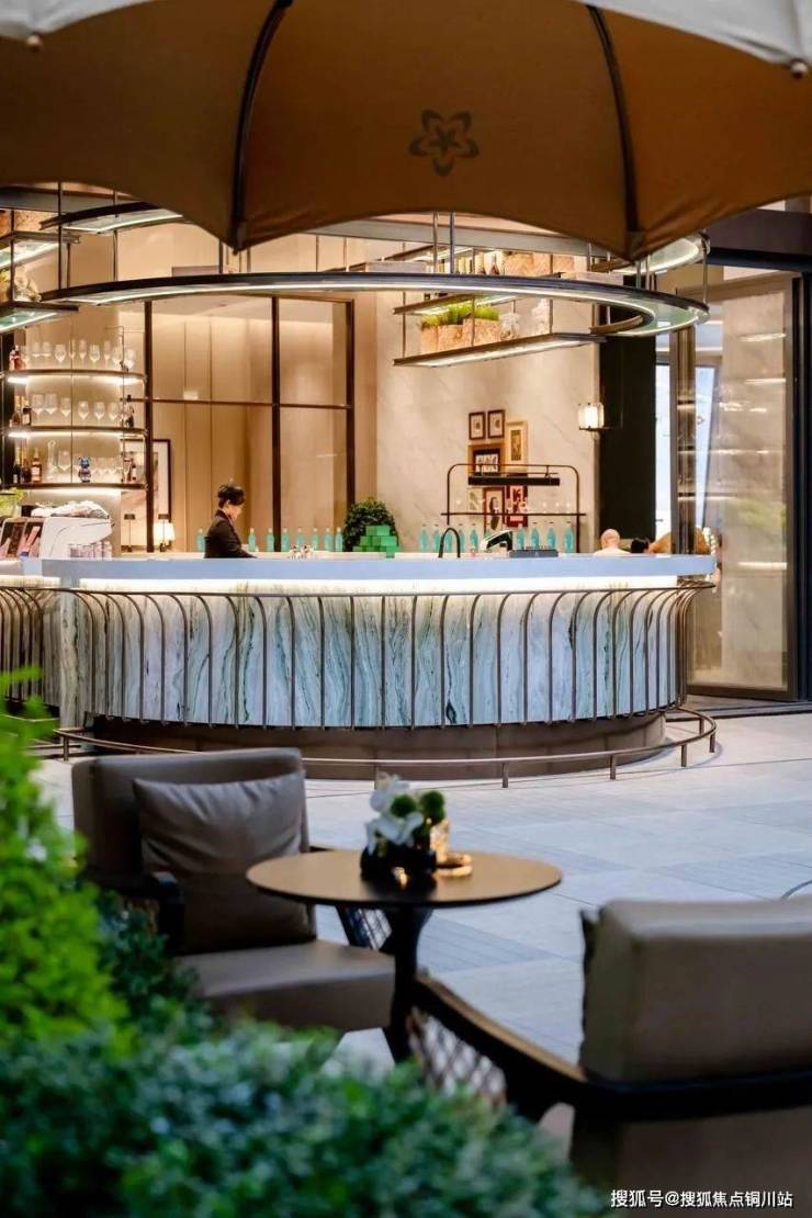 经过与华丽家族共创,我们在下沉庭院打造了一个很有特色的吧台,一半室内一半室外,完全打破了室内外的物理边界,两侧巨大的推拉窗也形成了内外可以交互的界面,使得空间更为开放通透。另外下层庭院幕墙都采用落地玻璃,这也为室内空间创造了绿色窗景,使人身心得到放松。