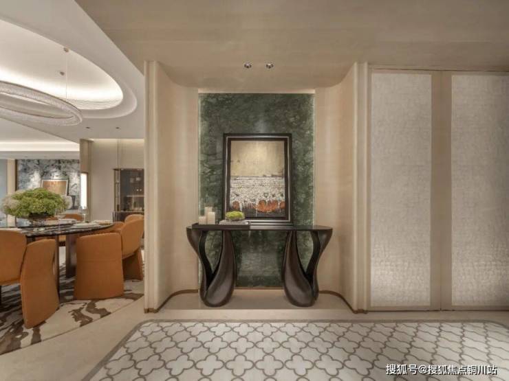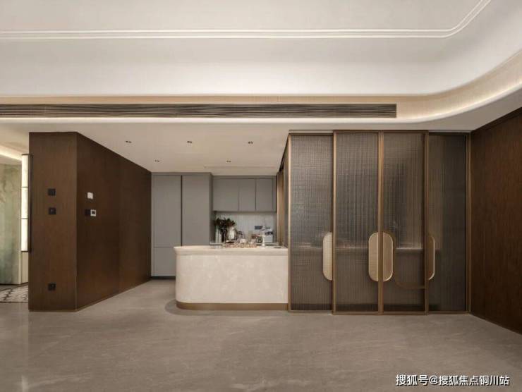 哪怕是在传统功能板块,整体墙面、柜体板材、精美纹路金属玻璃门相互映衬,呈现质感远高于市场普通豪宅