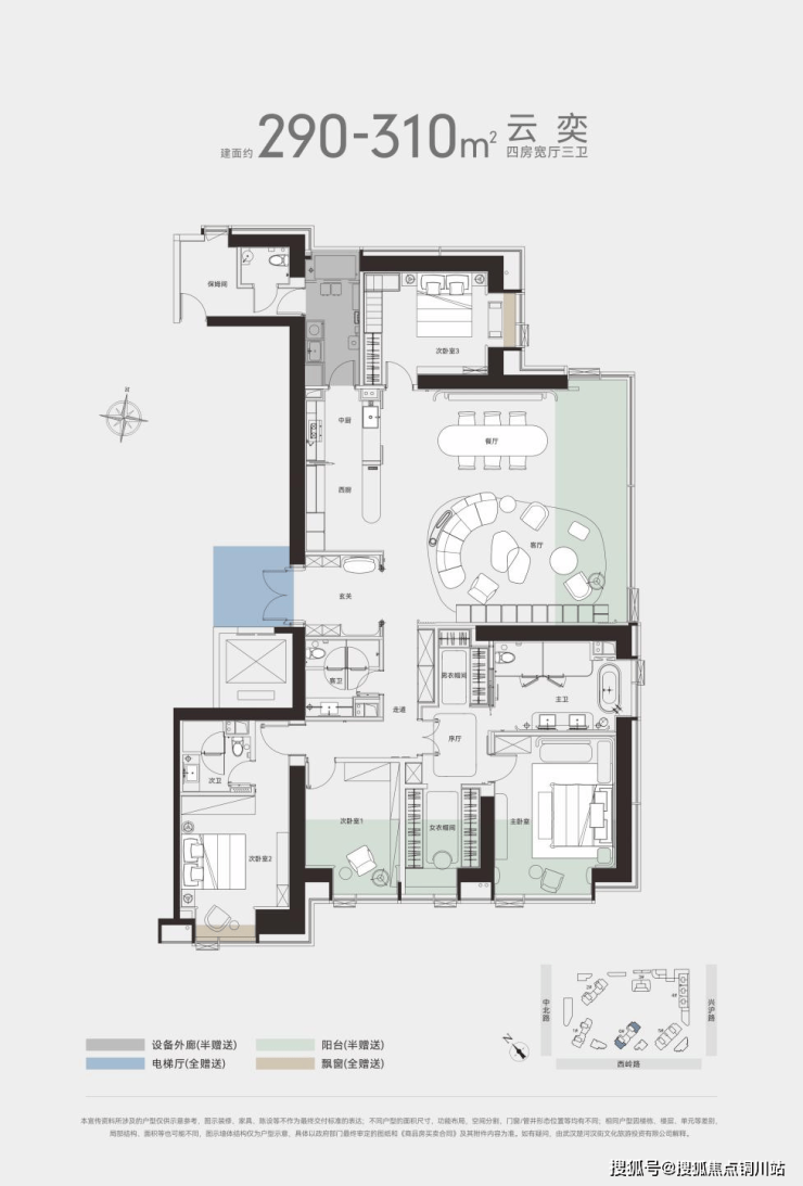 建面约290-310㎡,赠送比例更大,在保证空间尺度感的前提下尽可能多的优化承重柱,展现出更大的空间灵动性
