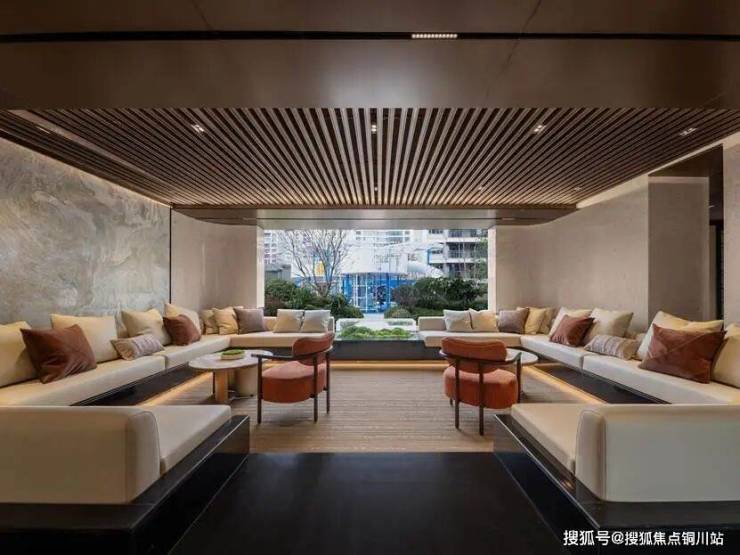 入户大堂与地下大堂通过圆弧造型、回型吊顶等设计语言形成呼应。首层大堂约265平方米,运用镜面拓展视觉空间,顶面金属漆质感细腻,防火门均做隐形处理,实现视觉统一。
