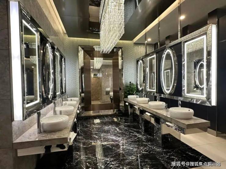 洗手间的装饰非常复古优雅,大理石肌理、黑白灰的色彩搭配,复古典雅的吊灯,营造出一种艺术氛围。网友不禁感叹:顶级洗手间,才是真正的流量密码。