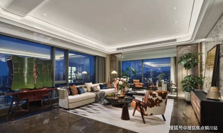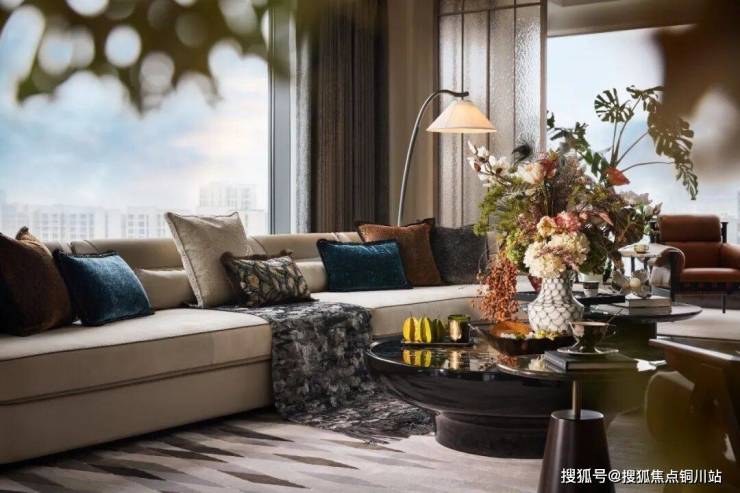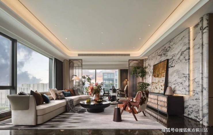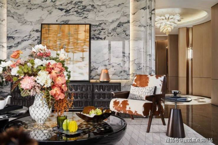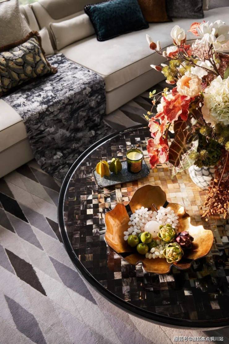客厅以非对称浅灰L型沙发为视觉中心,深浅对比真皮沙发与多纹理抱枕构建层次,以及马毛单人沙发与花卉圆凳形成半围合休闲区。大面的啡慕斯大理石地面,牛骨拼饰茶几与宝格丽黑石材的刚柔并济,与Art Deco渐变几何地毯呼应成趣。