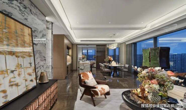 客餐厅间的结构横梁,以坝子桥凤凰亭檐脊为灵感,通过流线型曲面重构天花形态,在开放格局中,270度的观景视野,实现功能分区与视觉连贯的平衡。 玻璃金砖电视柜与抽象水流装饰画形成视觉轴线,对角布局的蝴蝶柜与艺术落地灯强化陈列仪式感。