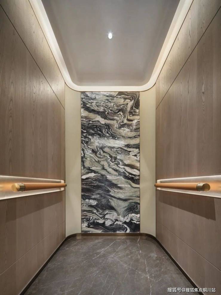 走出紫山水岩板的电梯轿厢,特别定制的银杏叶图纹双开装甲门,搭配玲珑抽象的“石”来运转艺术雕塑,立见开门见山的寓意,朴实稳重的精气神,传递富贵财运的美好意蕴。