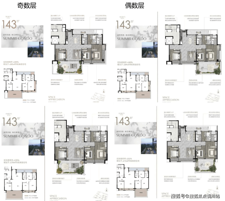 这部分空间不计入建筑面积,意味着在同样的产权面积下,业主获得的实际使用空间大幅提升。综合实际使用率至高可达130%+:建面约127㎡的户型,实际使用面积相当于传统高层住宅约150㎡;建面约143㎡的洋房,实际使用面积直逼传统高层住宅172㎡户型。