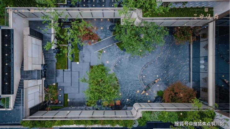 以现代设计语言重构江南意境。源鉴金陵胜景,以现代笔法演绎「四水归堂」。乌桕树影婆娑,红枫点染四季,一叶乌篷船静泊水岸,黑山石如墨笔勾勒,共同绘就一幅立体的当代水墨长卷。