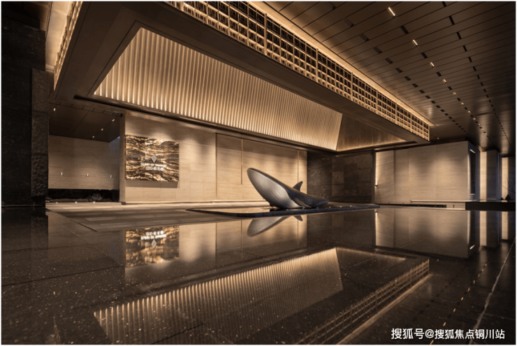 再看颗粒度。从大门到落客区,园林到入户大堂,步履之间,奢石带来的美,从不间断。比如,大门内“鲲跃星河”的艺术雕塑,搭配以意大利超白洞石和黄金丝绸等奢材铺就的门庭背景,呈现出了别具一格的艺术风范。