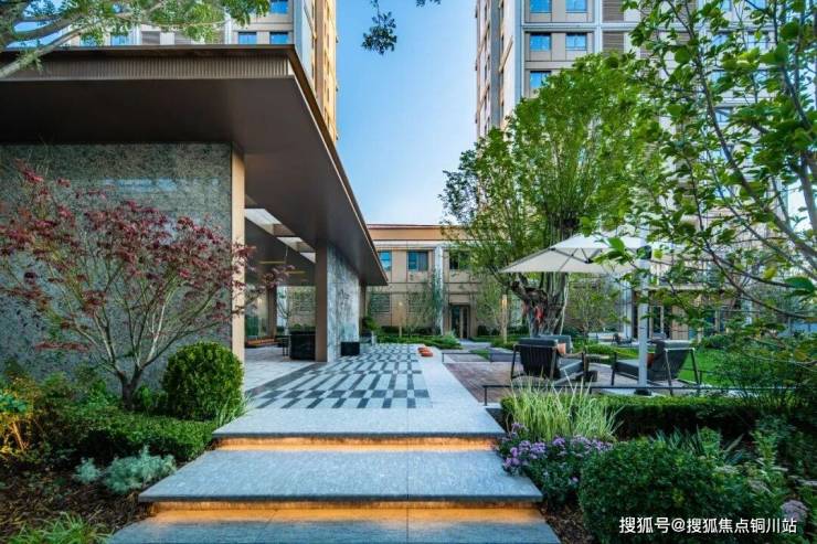 还特别关注首层业主的居住感受,底户对出空间以小地形塑造微景观,搭配造型植物、少量置石,通过留白的写意感增添室内视角的框景画意,营造自然、舒缓的观景氛围。