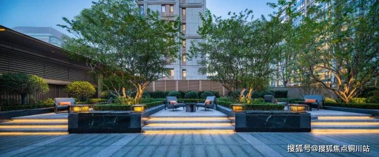 细致入微的设计理念还在于,对南侧两个地库廊架通过实体景墙进行围合,结合格栅、金属线条、灯光等元素,营造户外休闲空间,让园区的每一个角落都呈现优雅的视觉感受。