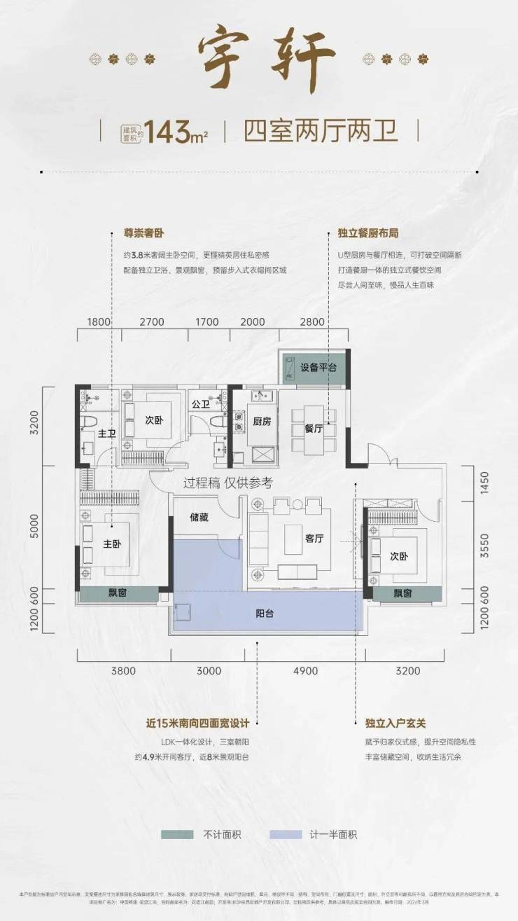 建面约143㎡户型四开间朝南,全明通透。
