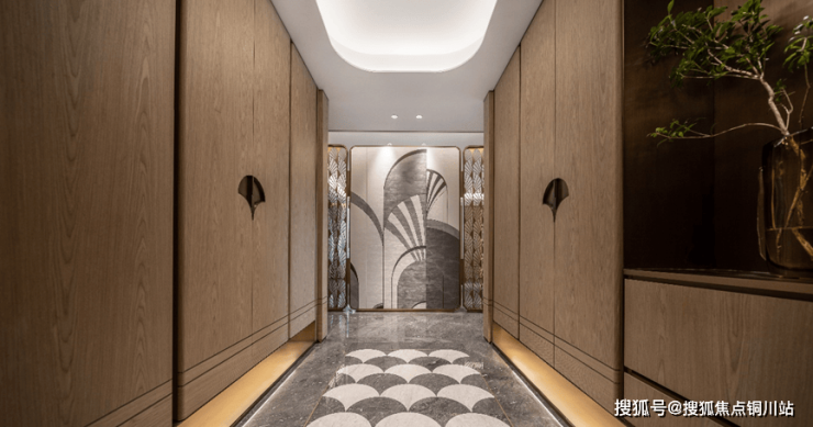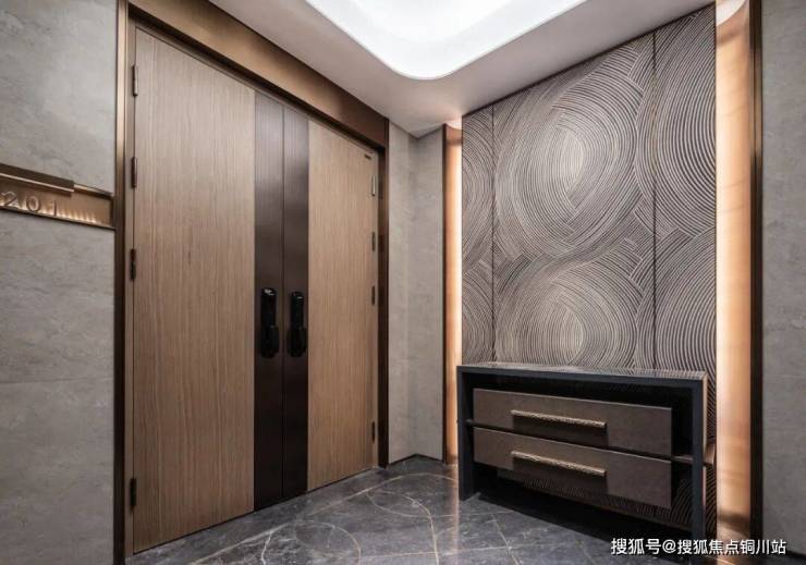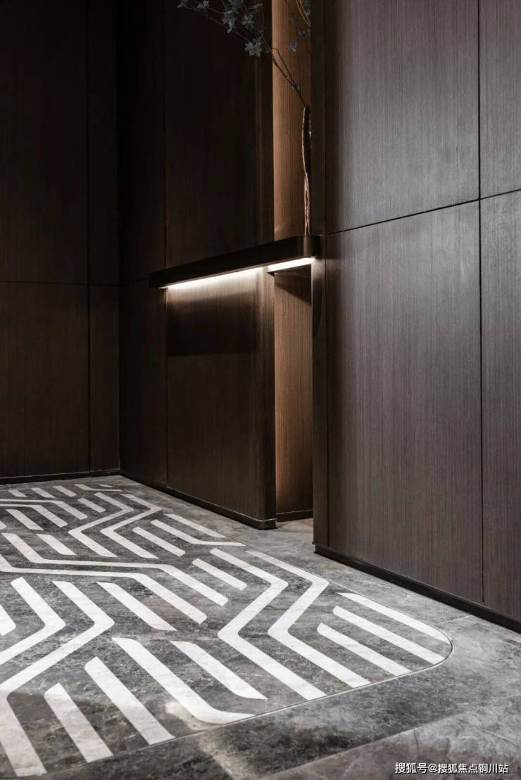 电梯门展开的刹那,元庐特色的弧线形吊顶,石材水刀拼花地面的“浪花”,质感极强的金属漆墙面,星级酒店客房才能看到的暖光打底门牌…,豪宅气息扑面而来。