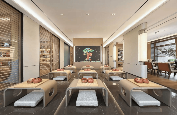 视觉的焦点是一场精心编排的东方叙事:中央镜面水景中,涌泉不息,其潺潺声息宛如一首欢迎曲;水中静立的一株日本冬青,以生命的绿意与稳定的形态,与水景构成一幅“动静相宜”的写意画。