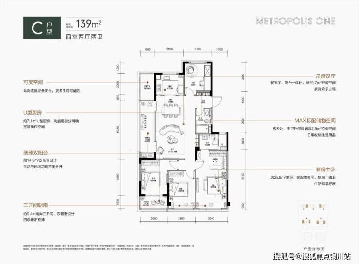 约139平方米的户型则展示了对生活品质的追求,宽敞的大厅设计让居室显得开阔,双阳台和双飘窗的设计巧妙地分隔了生活与休闲区。这样的环境使得每天的居住都成为享受。4室2厅2卫餐客厅阳台一体化,近约29.7㎡开阔空间,9.4m南向三开间,双飘窗设计约25.8㎡套房式主卧奢华衣帽间!