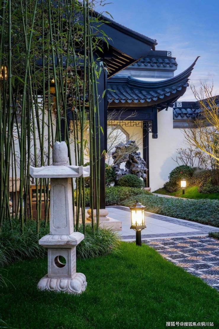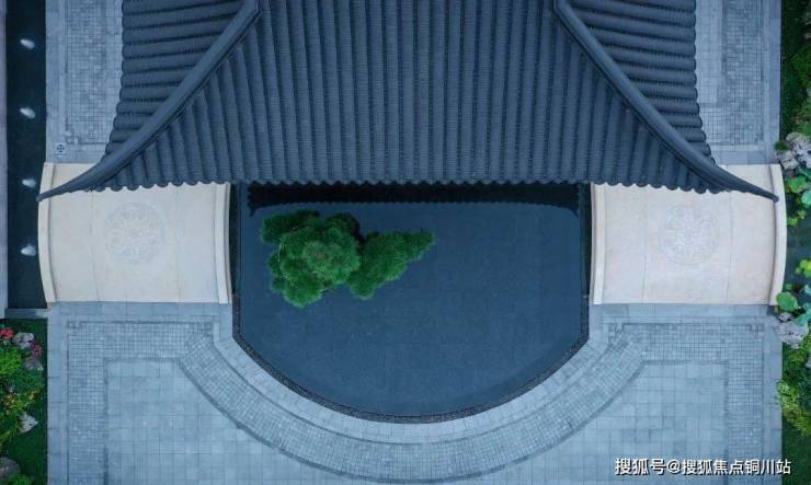 入口处,采用徽派青瓦白墙式门庭,三进礼序,中轴对称布局,颇具东方美学气韵。空间组合,层层进阶,两侧小桥流水,迎宾入府,造景水池,微波荡漾。营造出轴进有序的景观层次,周游天地,天人合一。