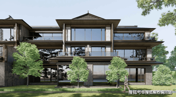 从已公布的合院效果图来看,外立面简洁流畅,顶部融入歇山顶,香槟色金属线条和金属镂空格栅点缀带来强烈的立体感,加上白玉画屏,带来立面的留白。