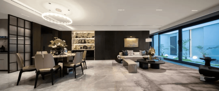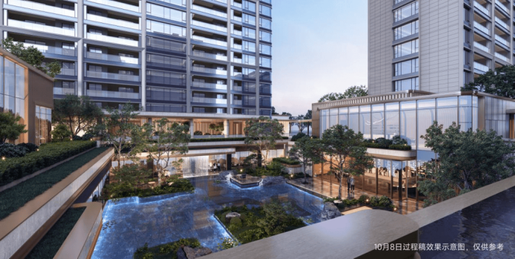 约8.5米奢华水景大门屹立,宽约48.5米,通体采用世纪雅钻石材和翠白玉搭配,磅礴恢宏,辅以双层挑高大堂,缔造豪华归家路线。