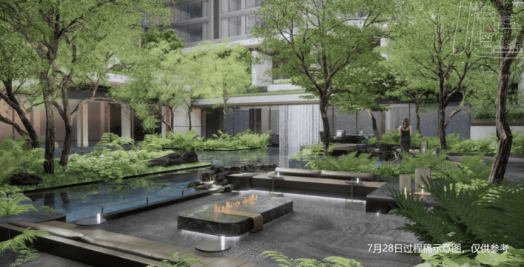 缓步至近千方下沉式庭院,当伫立镜面水系主景之时,只顿觉秋水共长天一色,心旷神怡。绿植错落,叠瀑潺潺,惬享下沉休息区内美景,这是视觉,触觉,听觉的一场盛宴。