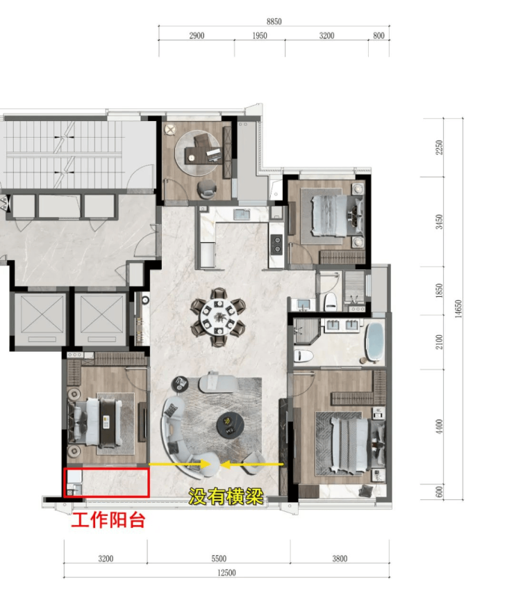 一方面毛坯交付利于业主装修,避免浪费,另一方面,毛坯能展现业主自身风格,避免了千篇一律。而室内和阳台的连通,则打破了传统的局限性,完全“消灭”了阳台的横梁与墙垛,将两处空间完美融合,极大限度地拓宽了空间感,主卧采用部分弧形的玻璃幕墙更将视野延伸到了极致,不再有空间拘束。
