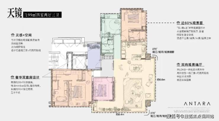 户型规划亦顺应江景及规划肌理,打造全景超广角观江的L型角厅户型——通过东向、南向双阳台设计,使整个产品拥有约60㎡的可观江景公区面积。形成270°视野,打造约6.6m的“观景角厅+环幕双阳台”的双向落地窗格局。把“东+南+北”所有能观景的面都打开,构成一个约35m宽观江面、近60%的观景视界(河西对岸只可西侧或北侧局部观江)。