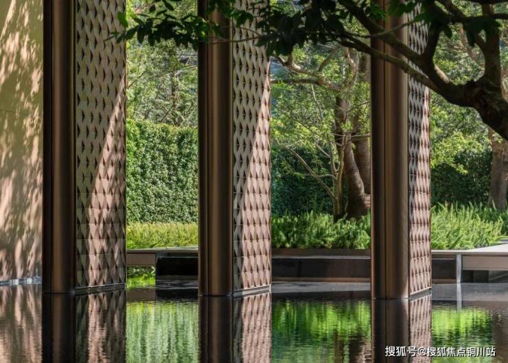 近3米宽的大堂挑檐延展出与外部相连的休憩空间,使人沉浸于邻近水院的幽静氛围。挑檐垂挂的格栅在光影交织下呈现细腻的变化,带来层次感丰富、温馨舒适的归家体验。