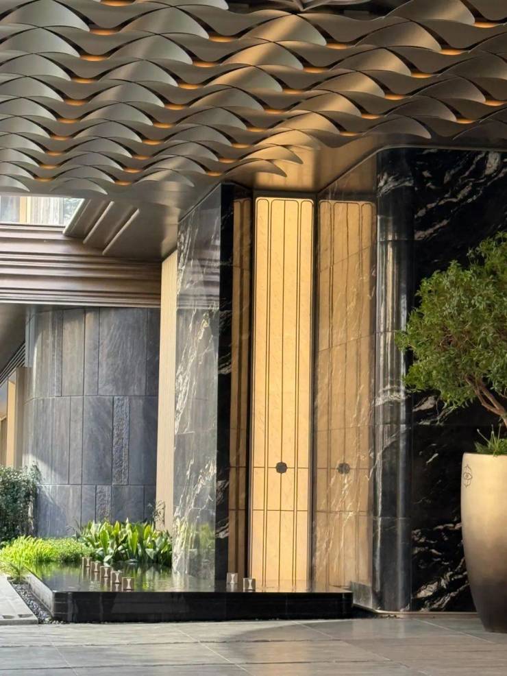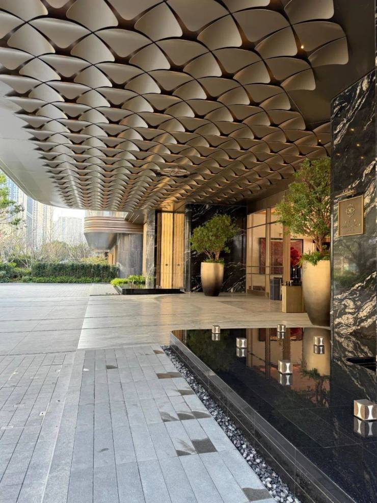雨篷下,双曲线金属叶片与定制灯具的光晕交织,营造出温暖而轻盈的归家氛围。