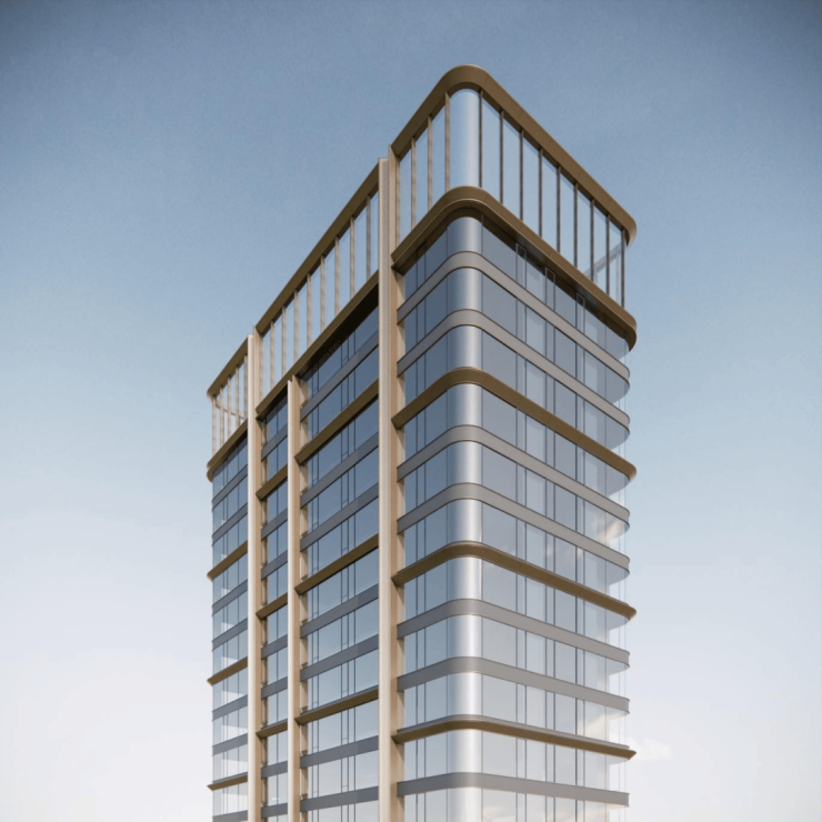 项目运用了全玻璃幕墙+香槟金色的金属线条为主的外立面,整体通过基座、中段、塔冠三段式进行颜色和线条的渐变,赋予建筑柔和的挺拔姿态。圆弧转角造型更是万科滨江一号的标志性立面元素,无论是主立面、玻璃幕墙拐角处,还是层间铝板线条、转角窗扇,都处处体现着这种圆润柔和的美学理念。