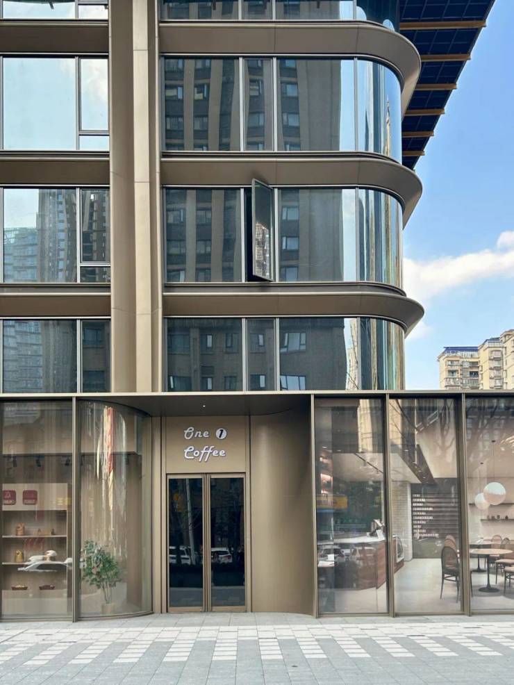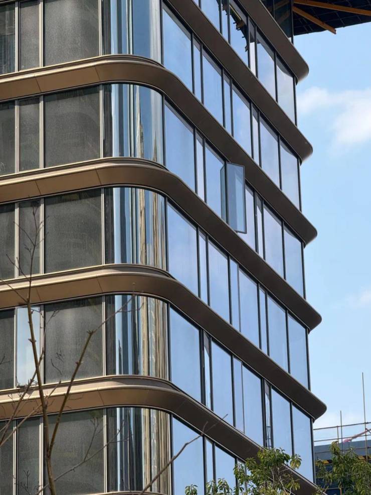 在材质上 选用玻璃慕墙,香槟金和闪银色的金属铝板 呈现品莹剔透感。弧形的墙面轮廓打破方正,仿佛也寓意着突破边界的设计暗语。