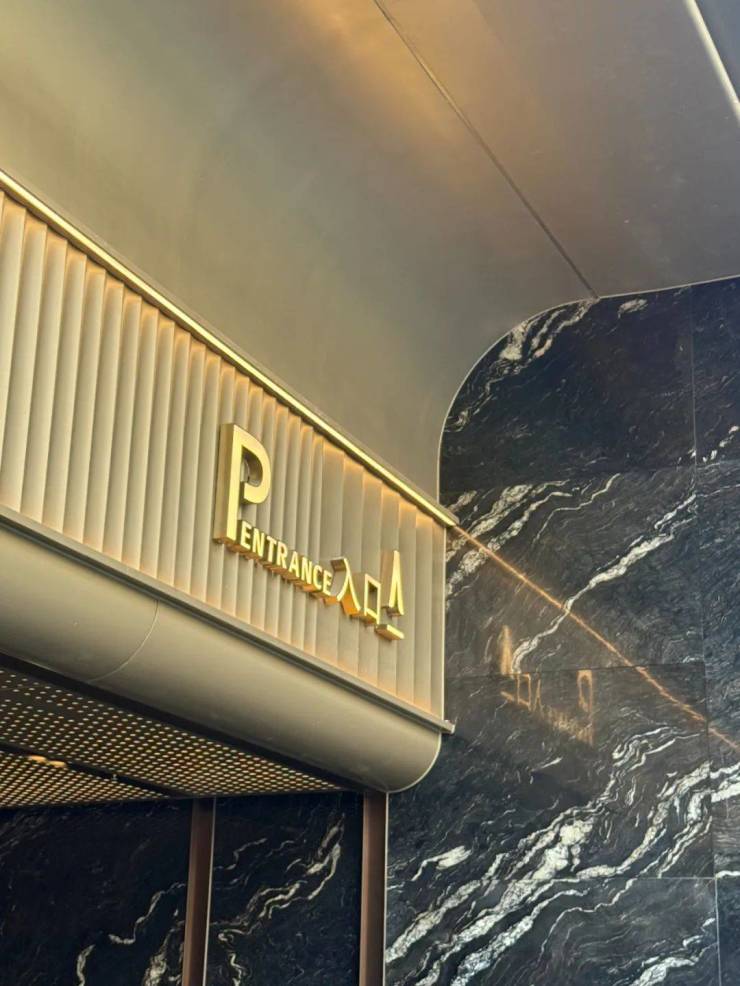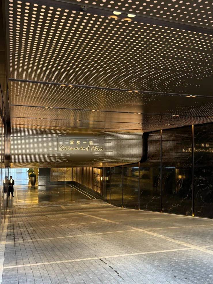 地库坡道穿孔铝板投射出的灯光点点,显得两侧墙面的黑色大理石格外奢华大气。