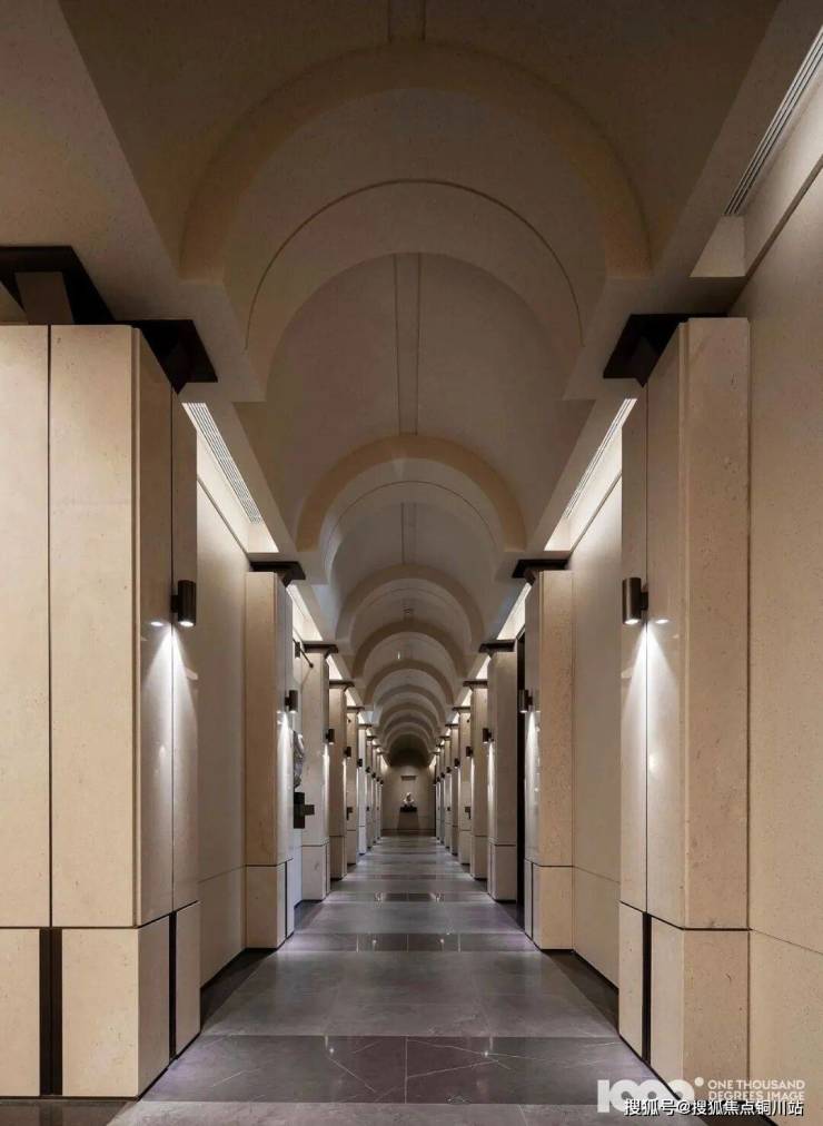 米白立柱列阵延伸,拱顶构成强烈的仪式感,尽头的雕塑刺破对称轴线,壁灯在墙面晕开暖金色涟漪。