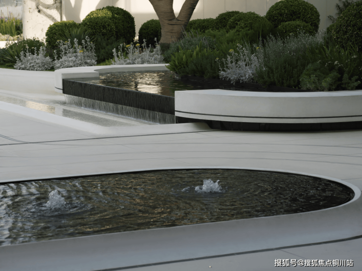 悬浮树池、石材景墙和茂盛绿植错落咬合,一条曲溪蜿蜒如绸,形成「水环玉、树抱堂」的东方礼序。