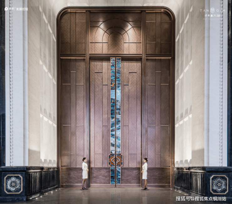 社区主入口的“光之门”,由国家非遗大师朱炳仁亲手打造。10.2米铜门以天津中国银行历史元素为灵感,融合日月星轨的光影设计,隐喻天津“河海通津”的时空定位,传递出传统与现代的对话。