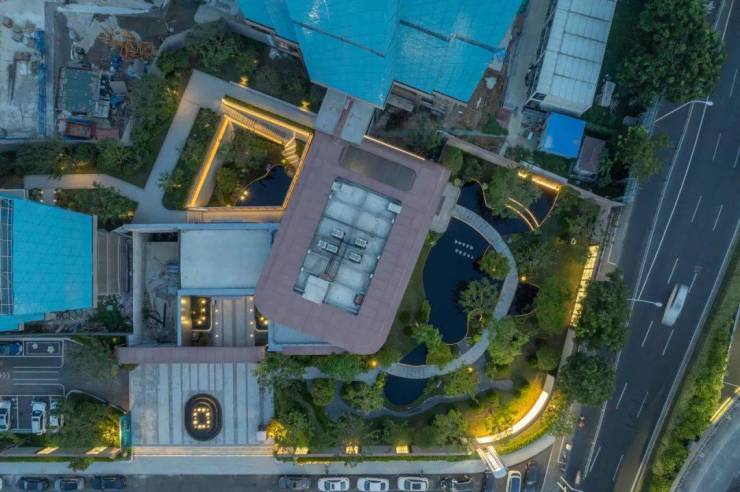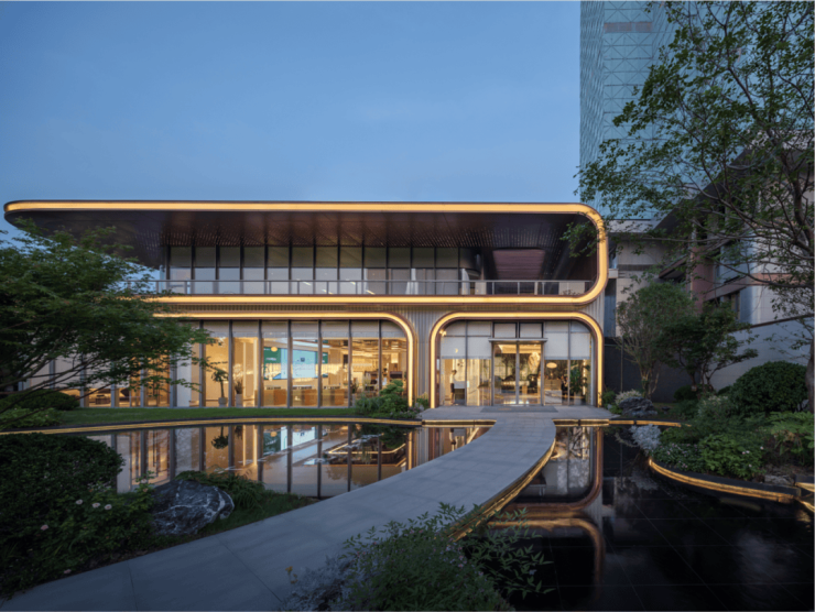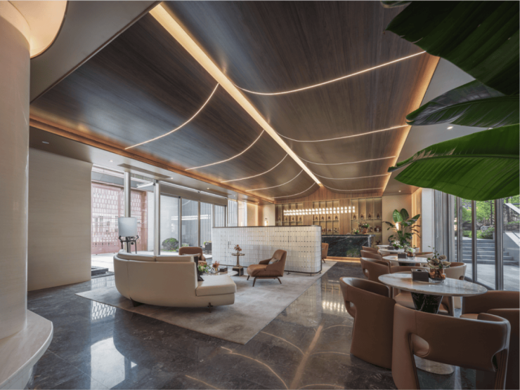 整体建筑以简洁的金属线条勾勒形体,流畅的曲线淡化了金属的硬朗,使建筑整体更加柔和,配合着屋顶大尺度飘檐,整体呈现低调精致的气质。阳光斑驳,镜心水院自然私密,与建筑相融,漫步其间,心境渐趋平和宁静,仿佛能洗净城市的喧嚣,寻回心灵的栖息之所。