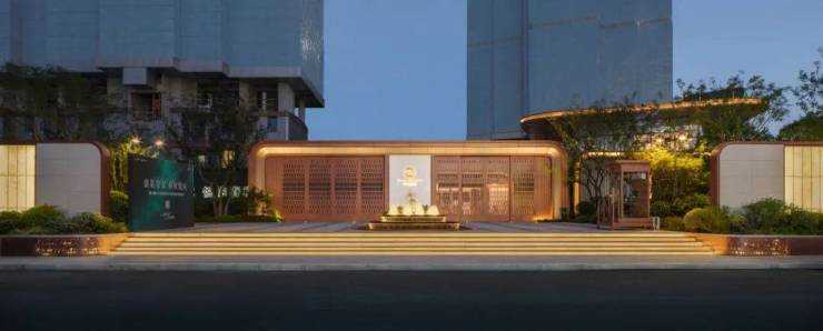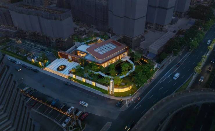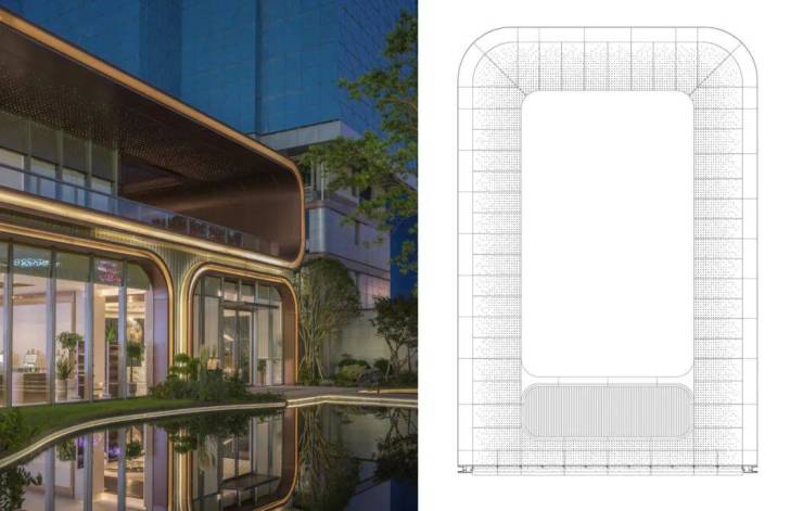 建筑主体以铝板与超透玻璃为主要材料,强调现代性与通透感。大块玻璃自由通透,模糊了室内外界限,玫瑰金的铝板展现精致的品质,内嵌暖色灯带中和金属线条的硬朗,屋顶飘檐采用穿孔铝板,透出了点点灯光,如星空般深邃内敛。开模定制的细部线脚,结合灯光构造,展现了立面的精致的科技感与现代工艺感。