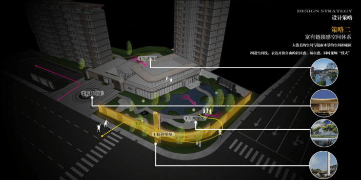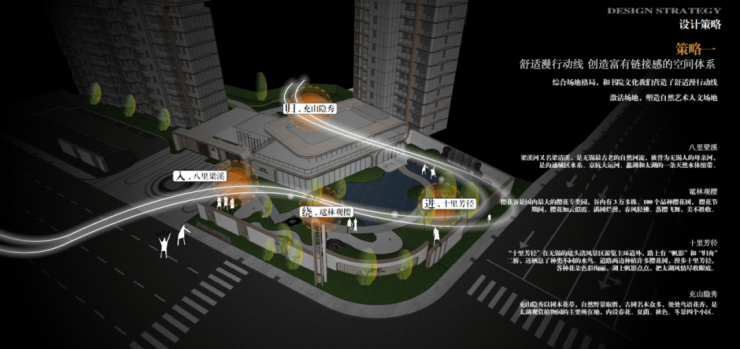 广勤路通江大道路口是城市与烟火的分界处,社区入口结合售楼处设在此处,面向城市,既能获得更好的昭示性,导入人流车流,又能隔离城市的喧嚣,链接烟火归家路,回归宁静家园。