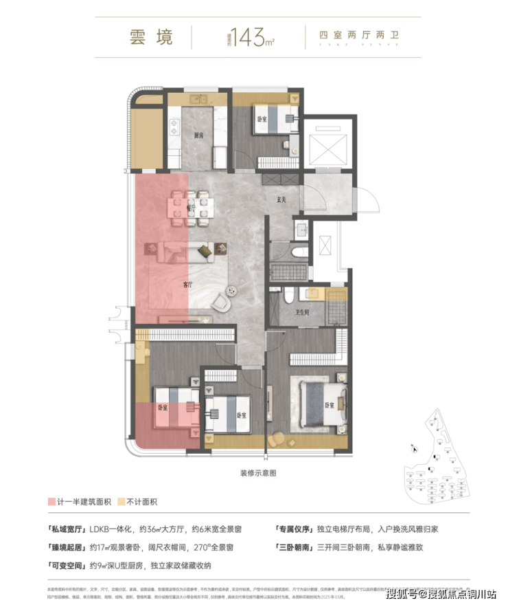🔹准四代户型设计,实现约93%-103%超高得房率,营造“270度全景舱”、“双主卧奢阔套房”、“LDKB+X无界空间”、“三开间阔绰尺度”等,呈献湖滨美学作品。
