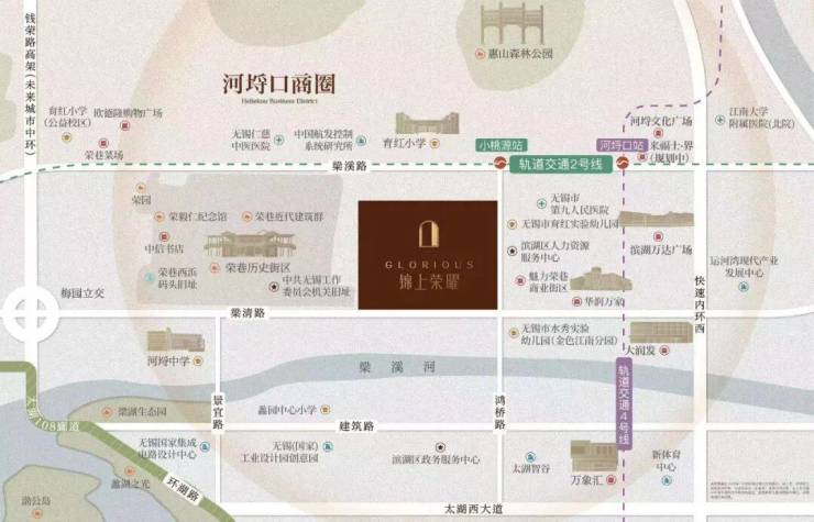 周边地铁2号线穿行而过,青祁路高架纵贯全城,构建起立体交通网络;荣巷老街的烟火气与现代商业街角的霓虹光影交织,演绎“古韵新生”的繁华图景;滨湖万达与万象汇以国际化商业矩阵引领消费潮流,育红小学、河埒中学串联全龄教育链,无锡第九人民医院与江南大学附属医院(北院)构筑健康屏障;更有惠山森林公园与锡惠公园的绿意倾泻,将“出则繁华,入则静谧”的栖居哲学凝练成诗。