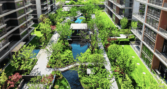 以《千里江山图》为蓝本,匠造「三轴五桥十二境」园林景观,保留原生堤岸58棵香樟,甄选珍稀古树名木、景石点缀其间,水系蜿蜒串联,将自然意境凝练于一园之中,构建起可栖、可赏、可传世的精神居所。