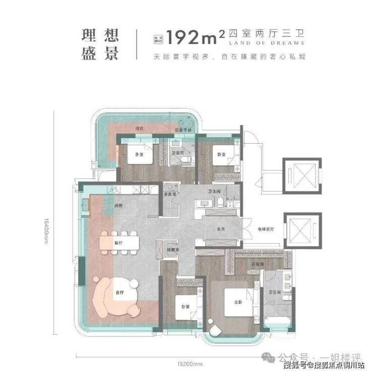 该户型约15.2米南向大开间+270°环幕视野,南北双豪华套房实现两代人居住平权,独立家政间、储藏室兼顾实用与格调,如同空中别墅,是终极改善的理想型。