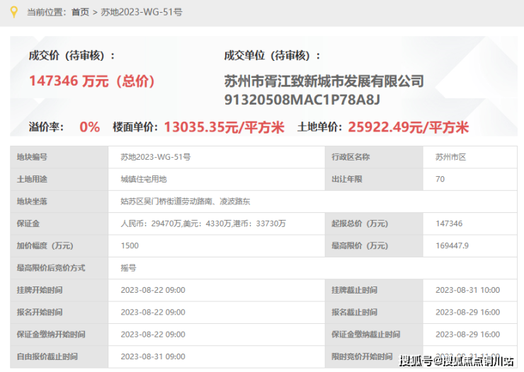 胥江澜岸,即,苏地2023-WG-51号地块,位于姑苏区吴门桥街道劳动路南、凌波路东,是2023年8月31日,苏州市胥江致新城市发展有限公司以底价147346万元竞得,成交楼面价13035元/平。