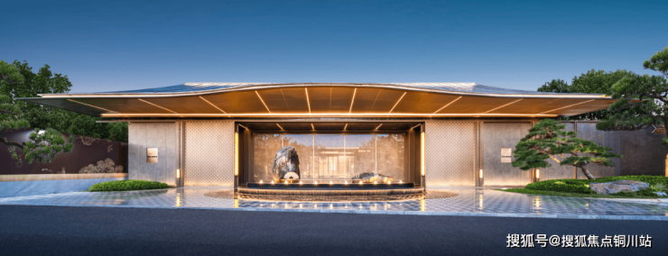 百年油松恭迎,叠水伴石映桃源,双排百年油松肃立迎宾,潺潺叠水轻叩景石,粉白山桃掩映其间,恰似《桃花源记》中 “忽逢桃花林” 的怦然心动,归家之仪自有气韵。
