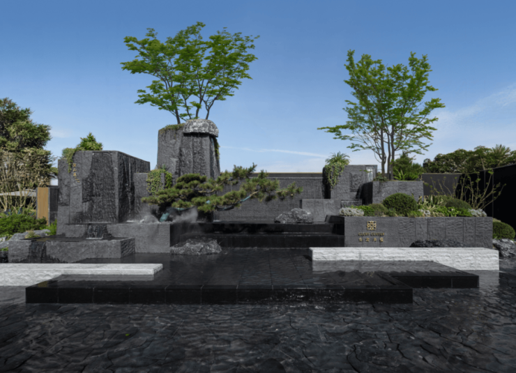 顶部挑檐“莲叶接天”,中间的蓝色水景与绿植,如莲叶浮于碧波,门前广场锃亮的镜面地砖、蓝绿色的中央景墙,模拟“无穷碧”的想象力。