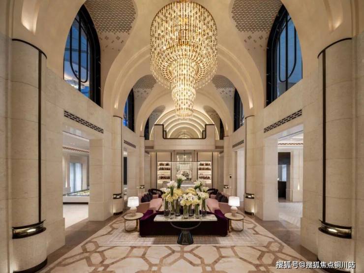 室内空间塑造上延续了建筑的拱形元素,空间形成有序的阵列、仪式感。走入空间高度由3.4m升至7.7m挑空,曲形的双挑楼梯延伸至2F,增加视觉冲击力。整体风格,现代典雅轻奢结合ARTDECO风格,墙面以贝金米黄石材为主,将现代元素与经典语汇相结合。卡里冰玉打磨成弧形面包石地面,立体、温润、柔和,见证了商业演变、是商业贸易历史的空间载体 ,是城市历史文化重要象征。