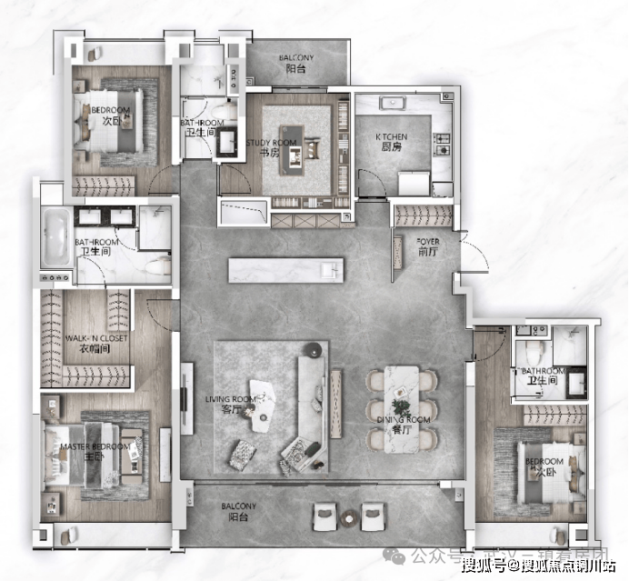 【大家风范,隽永之诗】纵横寰宇,约16米朝南开间横贯主次卧、客餐厅超100米楼间距,尽展辽阔视野,直面大师园景约8.4米南向阳台开间,墅级大横厅专属礼遇精妙南北双阳台设计,揽景与功能平分秋色酒店式双套房尺度,予私人定制般尊享日常