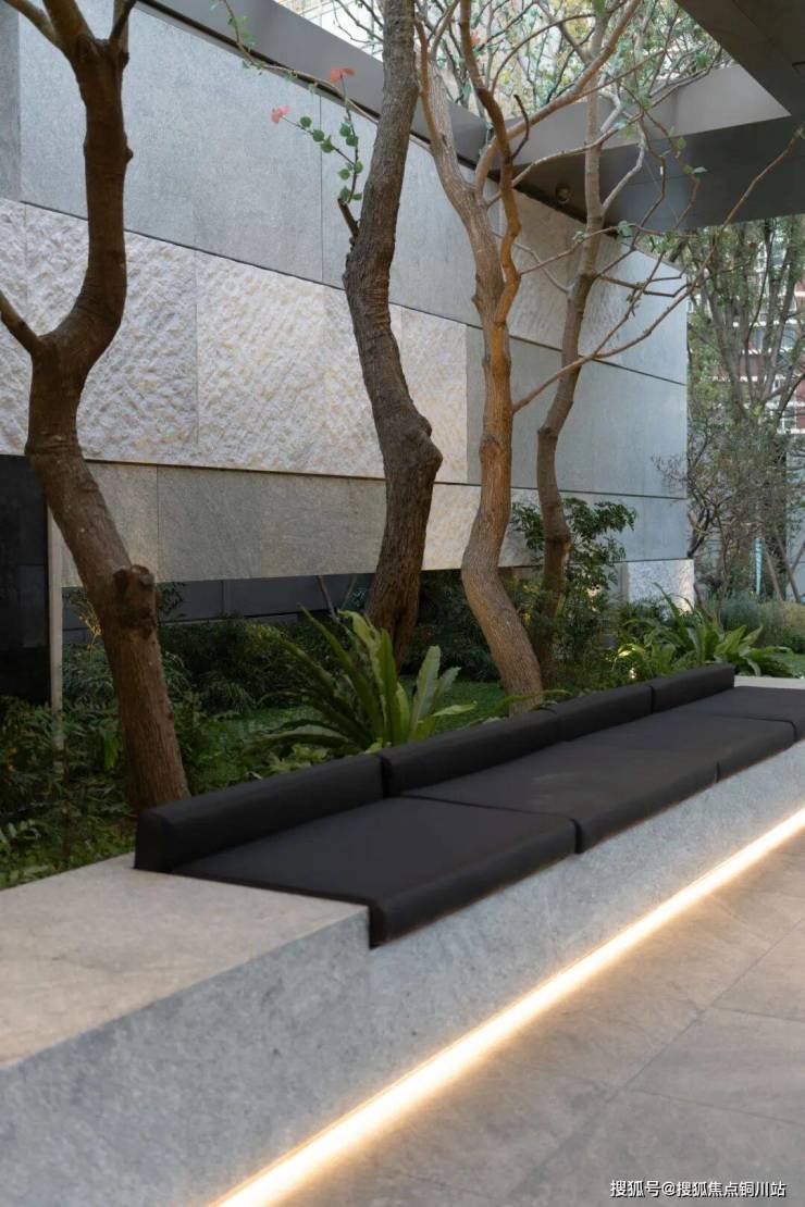 会客厅后,则藏有一处精巧花境,数株高大乔木将其温柔环抱,收拢为一隅静谧的森然画境。于此,目光所及是草木生长的盎然秩序,耳畔所闻是风过林梢的细微清。