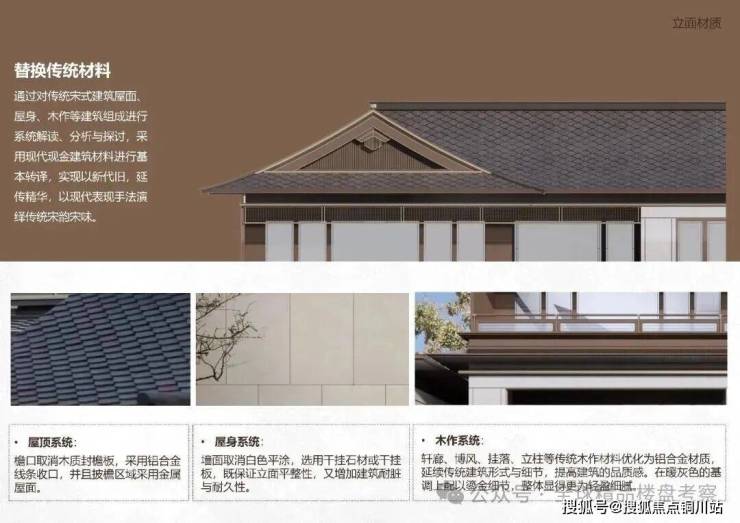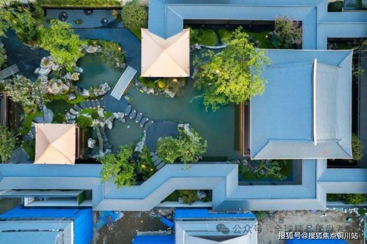 低层合院层高3.2m,南北通透,通过采光天井、全景落地窗优化自然采光与通风;立面采用浅灰色石材干挂+深褐色铝板干挂,屋顶采用装饰格栅+屋脊装饰构件等,中式风格。