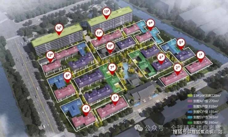 共14幢105户,合院联排12幢57套,洋房产品2幢48套,其中联排总高3层有270平(26套),310平(17套),合院335平(6套),365平(3套),390平(4套)最后一排是两幢总高7层(一楼架空)的洋房共48套。