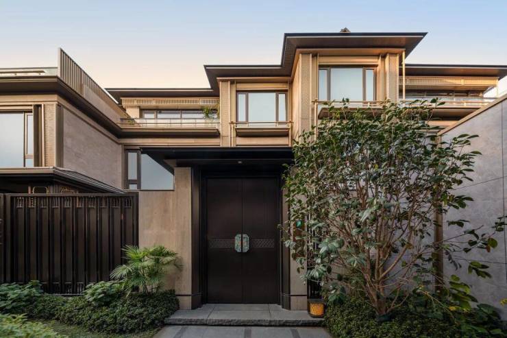 合院门头,别出心裁的选用“柴门形制+自然材质”。不同于其它中式产品 浮夸的“斗拱、匾额” 装饰,樾庐只是随意地用两根石质立柱+深咖色金属门扇”,轻轻几笔就勾勒出了隐逸之感。