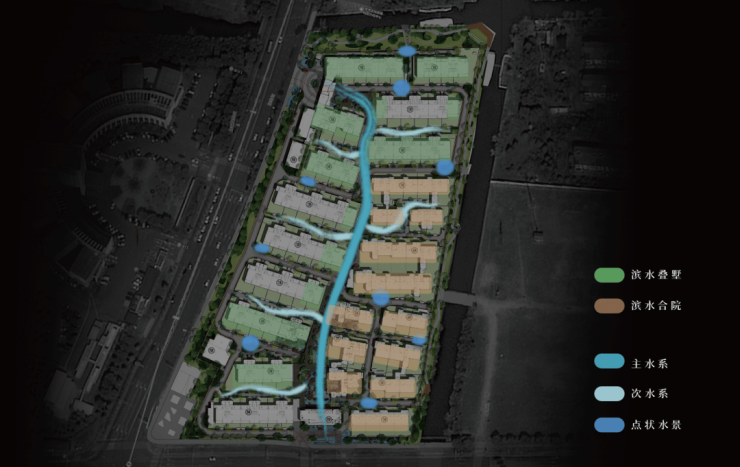 项目在外部打造约500米长水岸绿带「玉带湾」,呈现可漫步、可停驻、可社交的诗意栖居场域。内部以一条中心水轴「樾溪川」为核心,贯穿整个社区景观,一方面,营造“以水为脉、理水造园”的流水院墅生活;另一方面,也借由水系自然地划分两大业态组团。